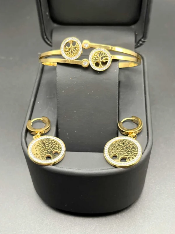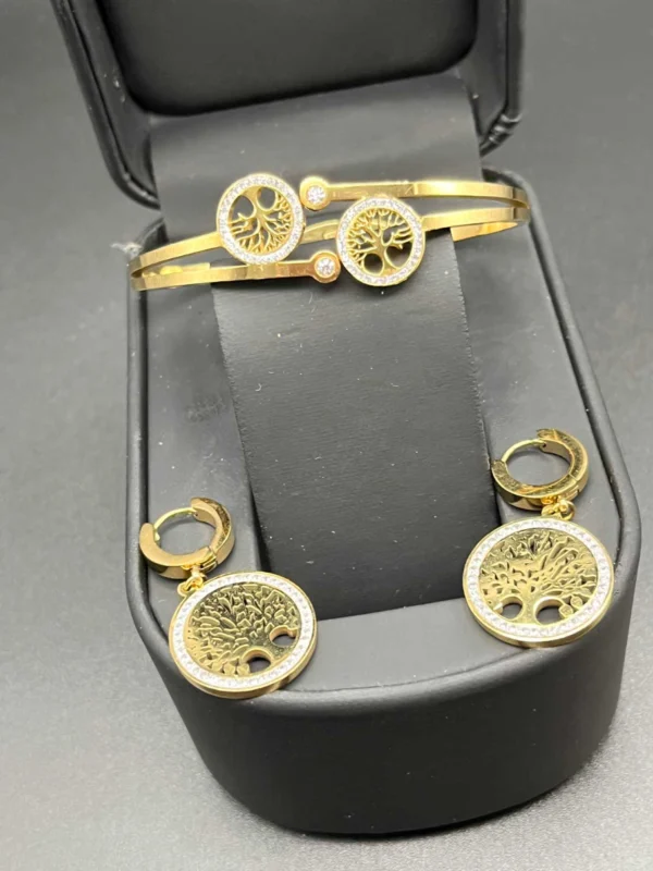 Exklusivt set med 3 trädformade guldarmband och matchande örhängen i rostfritt stål. Slitstarka, bekväma och designade för en tidlös look som håller.