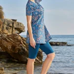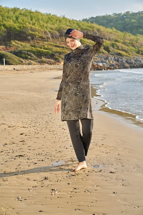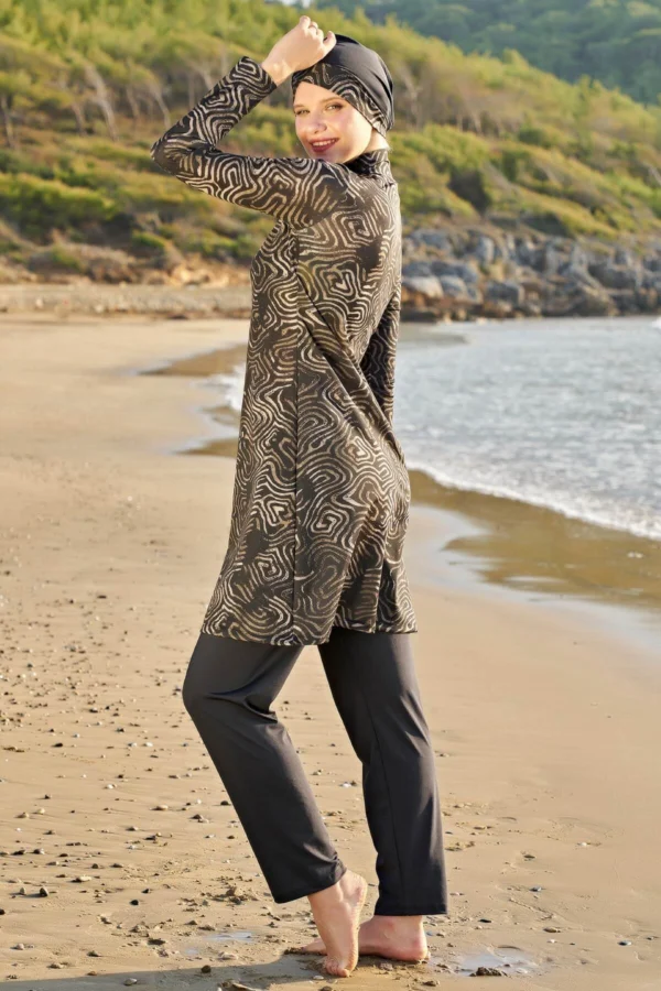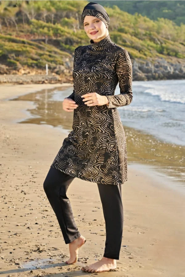 Designen består av en långärmad topp med integrerat huvudstycke eller matchande hijab samt bekväma byxor. Toppens längd och byxornas passform ger full täckning och en smickrande silhuett med obegränsad rörelsefrihet. Det eleganta mönstret är strategiskt placerat för att framhäva den naturliga skönheten – från abstrakta former till blomstermotiv i smakfulla färgkombinationer.