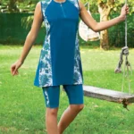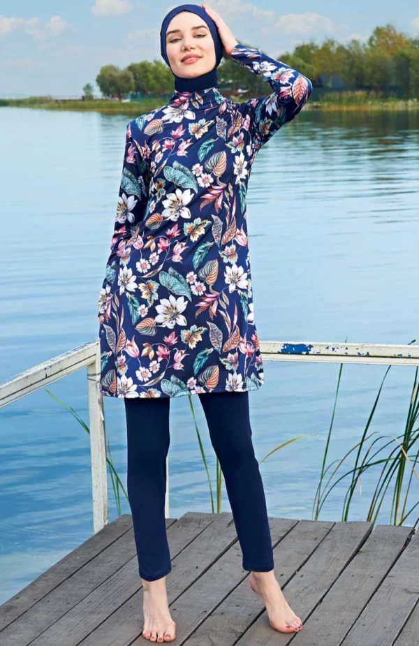 Heltäckande baddräkt för beslöjande kvinnor. Består av en hijab som täcker håret och nacken, en längre topp i blommigt mönster, och ett par byxor i elegant marinblå färg. Tillverkad av högkvalitativ lycra med snabbtorkande egenskape