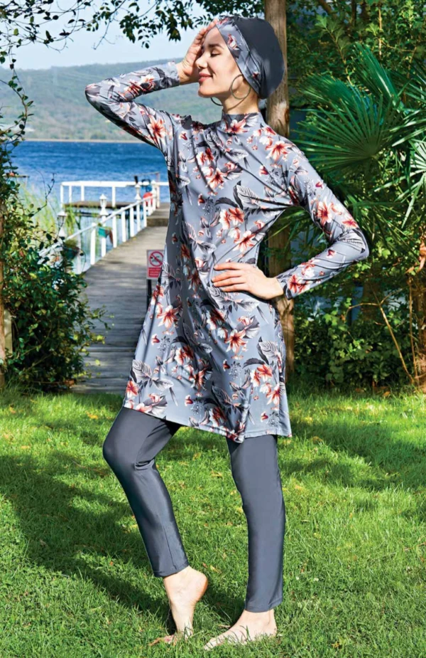 Eleganta grå blomstrade burkinin inkluderar en längre långärmad topp, matchande byxor och en turban med blomstrat band. Dess snabbtorkande egenskaper gör den till det perfekta valet för sommaren.Burkini 2025