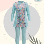 Burkini i blandade färger med blommigt mönster och hijab – en elegant och funktionell baddräkt för dig som söker täckning, komfort och stil i ett och samma plagg.