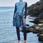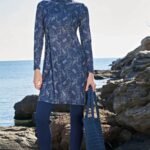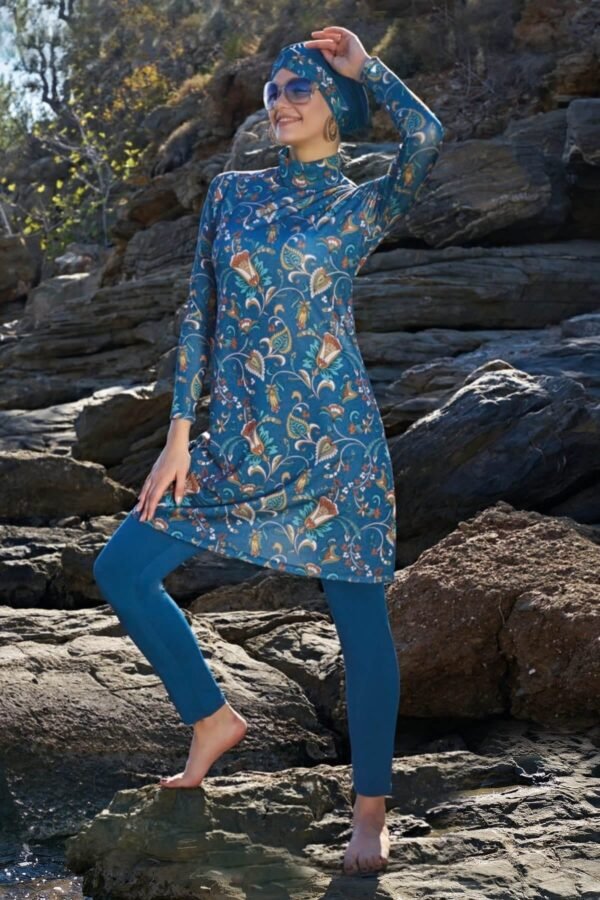Designen har ett vackert marinblått blommönster och levereras med en matchande huvudduk för full täckning. Den höga ståkragen med turtleneck ger extra komfort och skydd. En inner-bh ingår i paketet för ökat stöd och bekvämlighet.