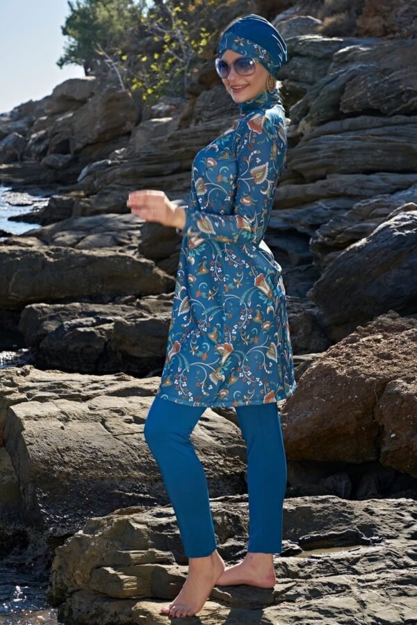Designen inkluderar ett vackert marinblått blommönster och levereras med en matchande huvudduk för full täckning och stil.