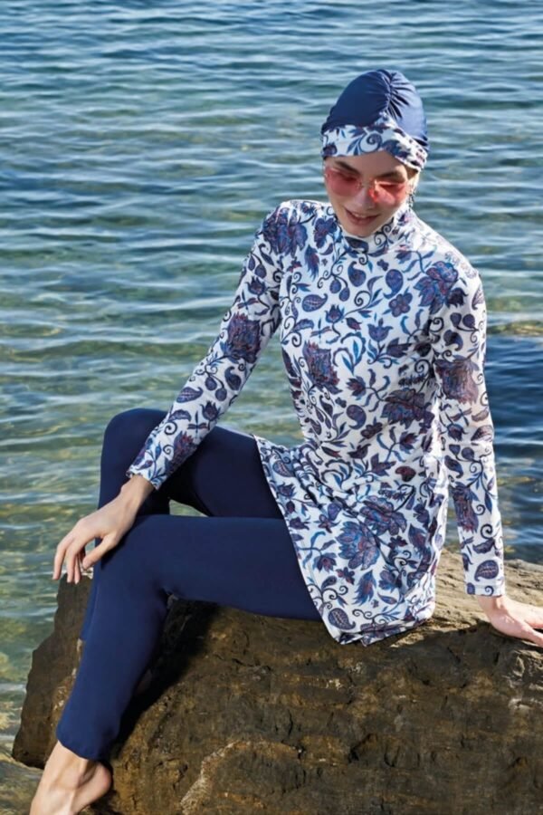 Marinblå mönstrad burkini är en av våra mest populära baddräkter – perfekt för att göra din sommar både bekväm och stilfull!