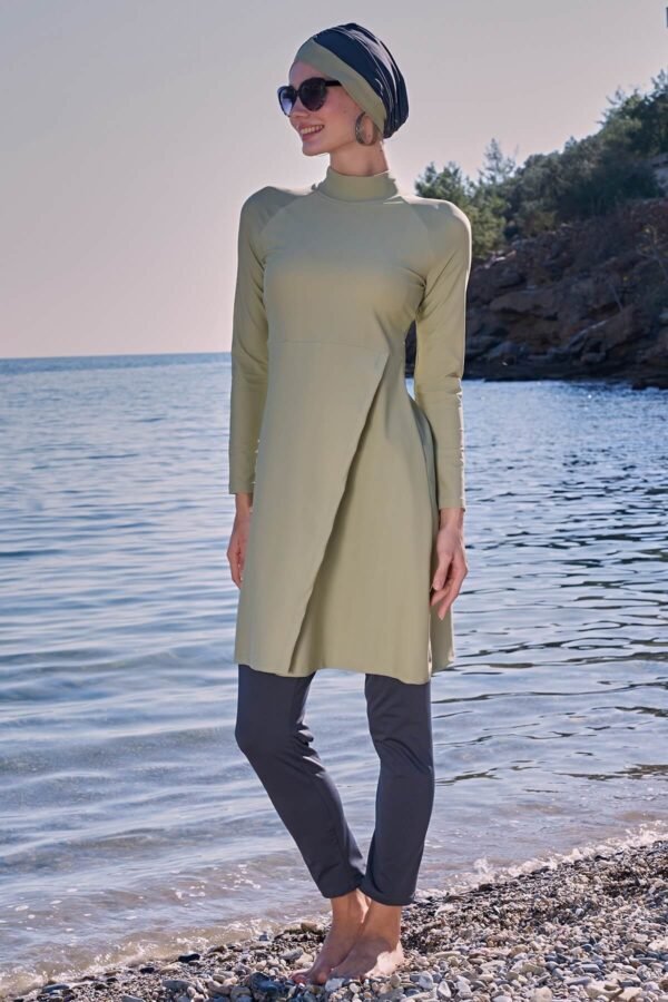 Grågrön burkini med raglanärm – designad för maximal komfort och täckning under dina simsessioner.