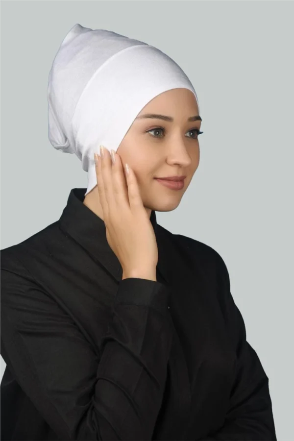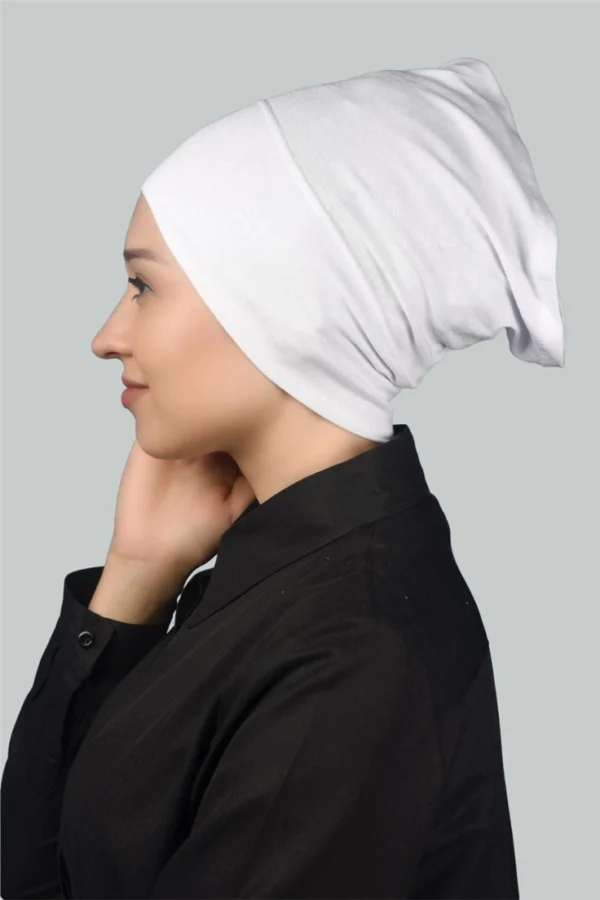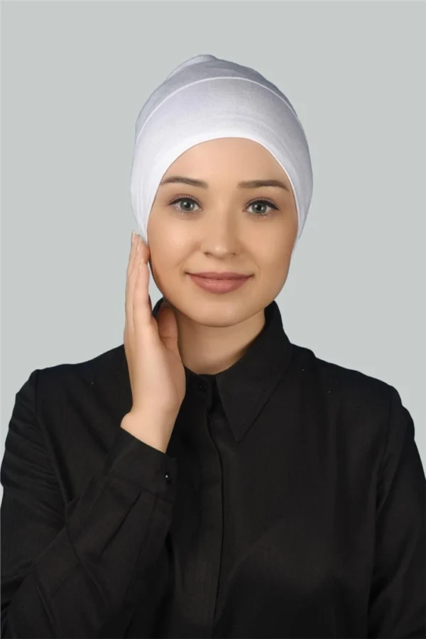 Den klassiska vita färgen är ett mångsidigt val som fungerar utmärkt under alla typer av hijab – vare sig det är färgstarka sjalar, mönstrade tyger eller transparenta material som chiffon och satin. Den fungerar som en neutral bas som inte syns genom din hijab, samtidigt som den håller allt på plats med stil.