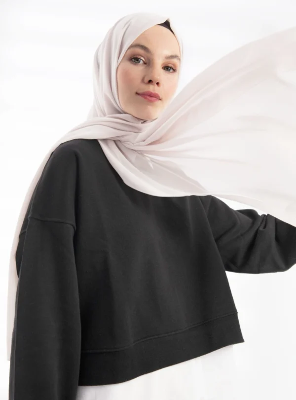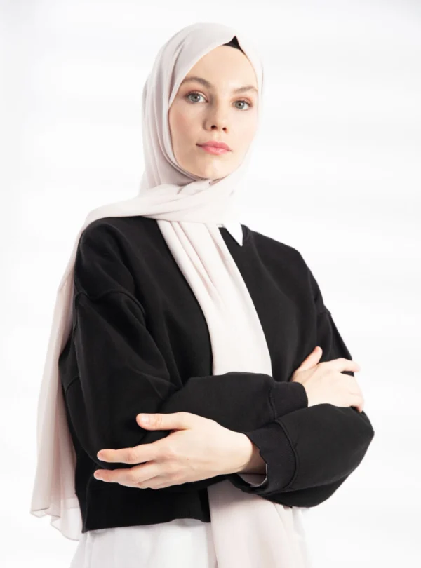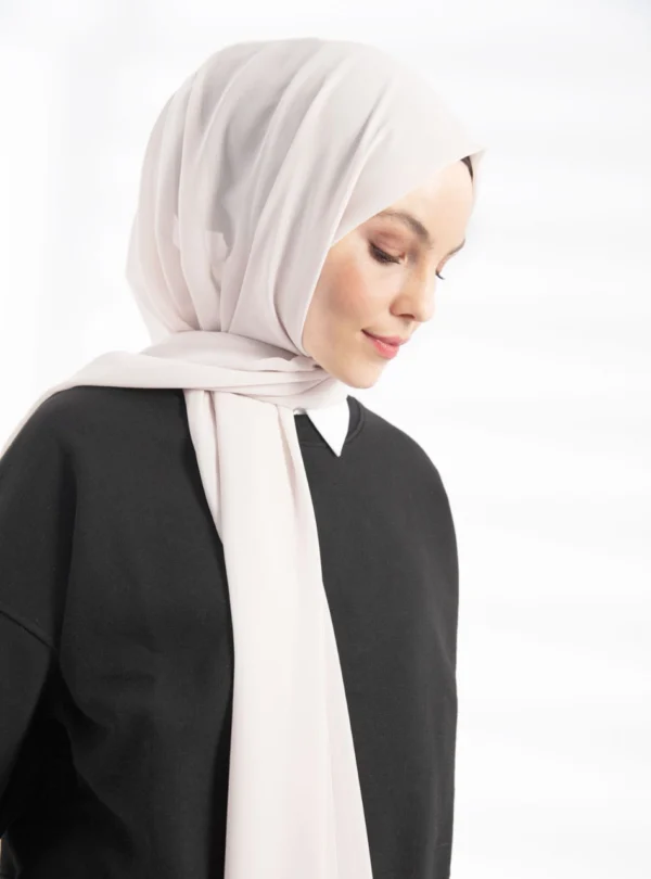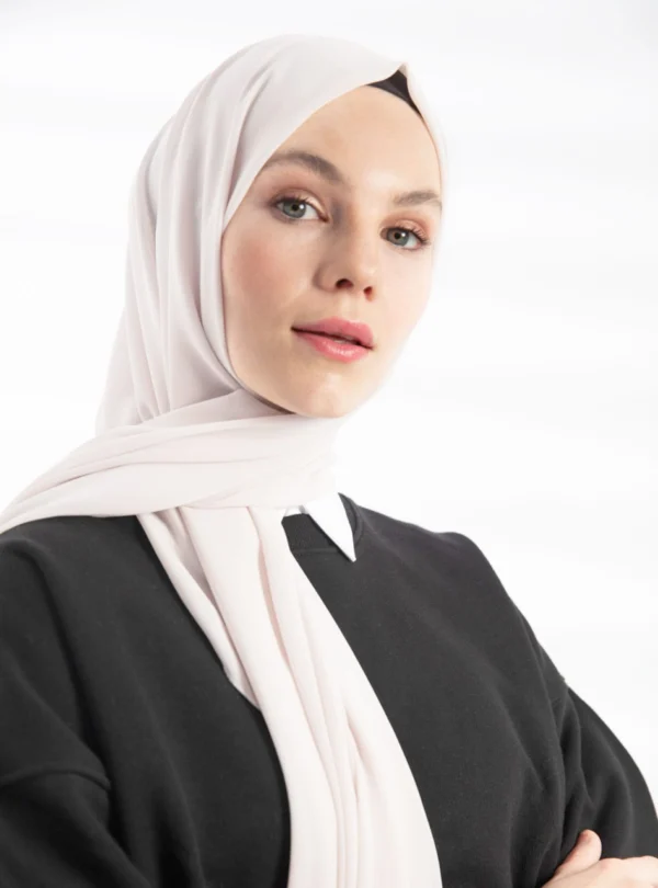 Tillverkad i högkvalitativt crepe chiffongtyg är denna hijab både lätt och luftig, vilket ger en skön känsla mot huden under hela dagen. Materialet har en vacker textur som ger ett naturligt fall utan att kännas tungt eller obekvämt. Tack vare dess neutrala färg kan du enkelt matcha den med alla typer av outfits – från klassiska abayas till moderna modestil-inspirerade kläder.