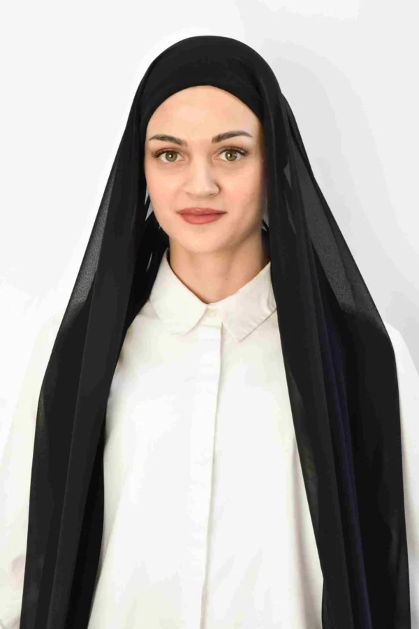 Upptäck stil, komfort och funktionalitet med vår Instant Chiffon Hijab Med Underslöja i Svart. Denna hijab är perfekt för kvinnor som vill ha en snabb och elegant look utan att kompromissa med bekvämlighet. Kombinationen av en lätt och flödande chiffon med en mjuk och andningsbar underslöja skapar ett plagg som inte bara är vackert utan också extremt praktiskt.