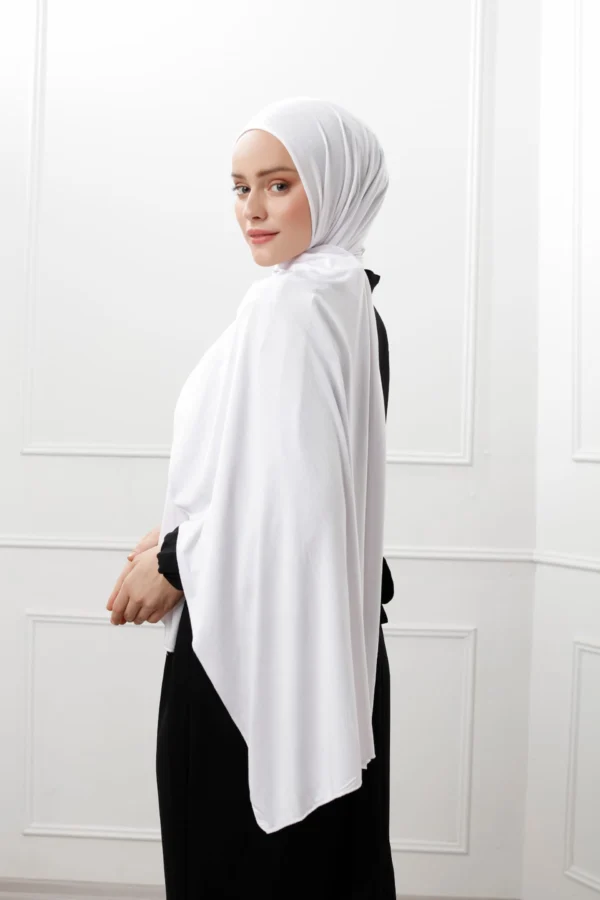 Premium Jersey Hijab – Vit är skapad för kvinnor som vill förena modernt modest mode med traditionella värderingar. Den behåller sin form och färg även efter upprepade tvättar och är ett hållbart val för dagligt bruk.