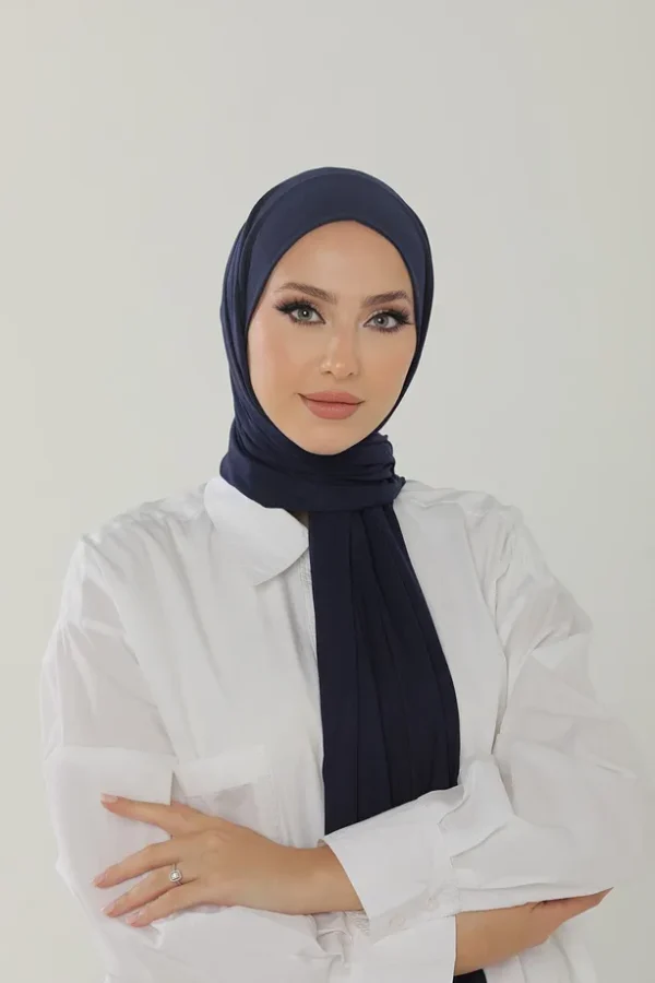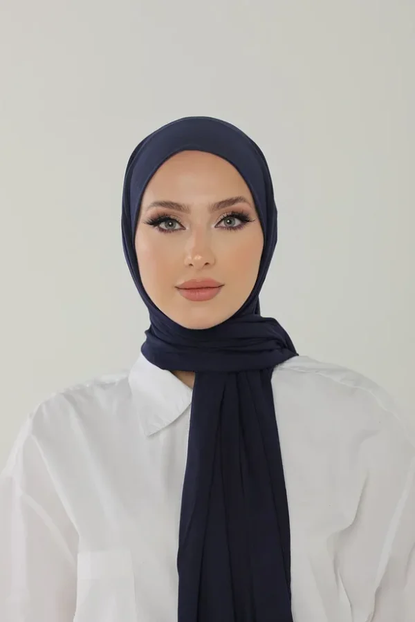 Elegant och mjuk hijab i Marinblå Stretch Jersey – perfekt för både vardag och fest. Andningsbar, lätt att forma och passar alla stilar.