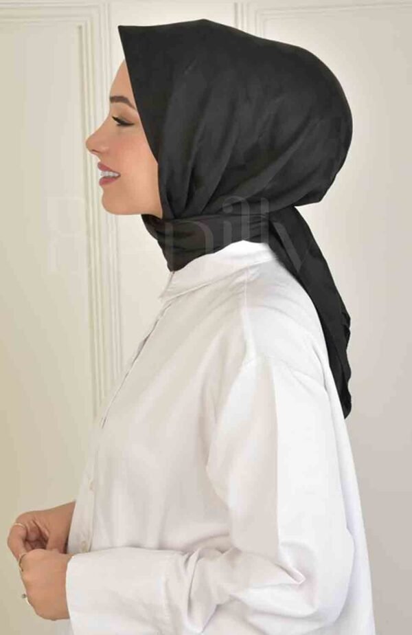 Den kvadratiska formen är särskilt uppskattad eftersom den ger fler möjligheter för kreativa draperingar. Du kan välja en enkel knut för en minimalistisk stil eller en mer strukturerad vikning för en sofistikerad look. Tack vare den neutrala svarta färgen blir hijaben en tidlös investering som du kan bära säsong efter säsong.