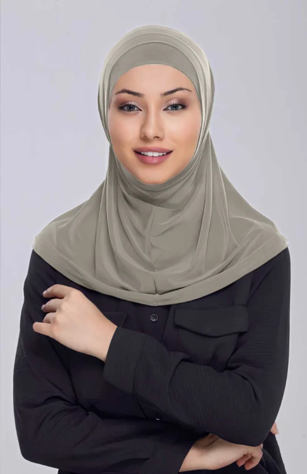 Den neutrala beigea färgen är lätt att matcha med olika outfits och passar utmärkt för alla årstider. Med sin sömlösa passform och praktiska design är denna hijab ett oumbärligt plagg i varje muslimsk kvinnas garderob – särskilt för dig som vill kombinera modest täckning med snabb och bekväm användning.