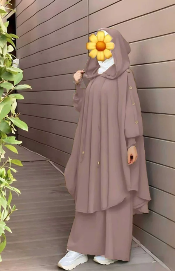 Den sofistikerade taupe-färgen tillför en känsla av lugn och tidlöshet. Den är otroligt mångsidig och enkel att kombinera med olika hijabs, underkläder och accessoarer, vilket gör att du kan skapa en mängd olika looks för olika tillfällen. Detta gör den till en idealisk vardagsjilbab såväl som ett lämpligt plagg för bönkläder. Som en komplett jilbab erbjuder den en helhetslösning för din modesta garderob.