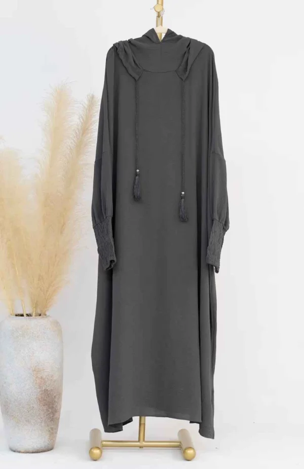 Hoodie Sport Abaya – Mörkgrå utmärker sig med sin integrerade huva, vilken inte bara erbjuder praktiskt skydd mot väder och vind, utan också tillför en modern och sportig dimension till din look. Huvan är perfekt för oväntade regnskurar, blåstiga dagar eller för att ge en extra touch av urban chic.