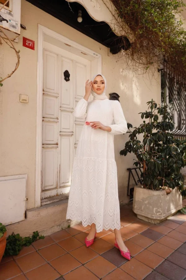 Långärmad Klänning Med Broderie Anglaise – Vit