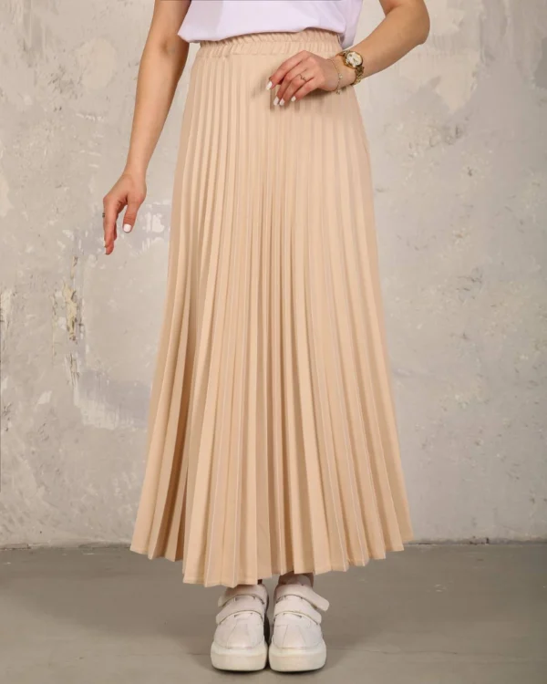 Omfamna sofistikerad stil med vår plisserade kjol i beige – ett perfekt val för kvinnor som vill kombinera tradition och modernitet. Den varma, sandfärgade tonen gör kjolen mångsidig och lätt att matcha med både neutrala och färgstarka accessoarer. Perfekt för Ramadan, Eid, bröllop, fester eller eleganta vardagsoutfits.