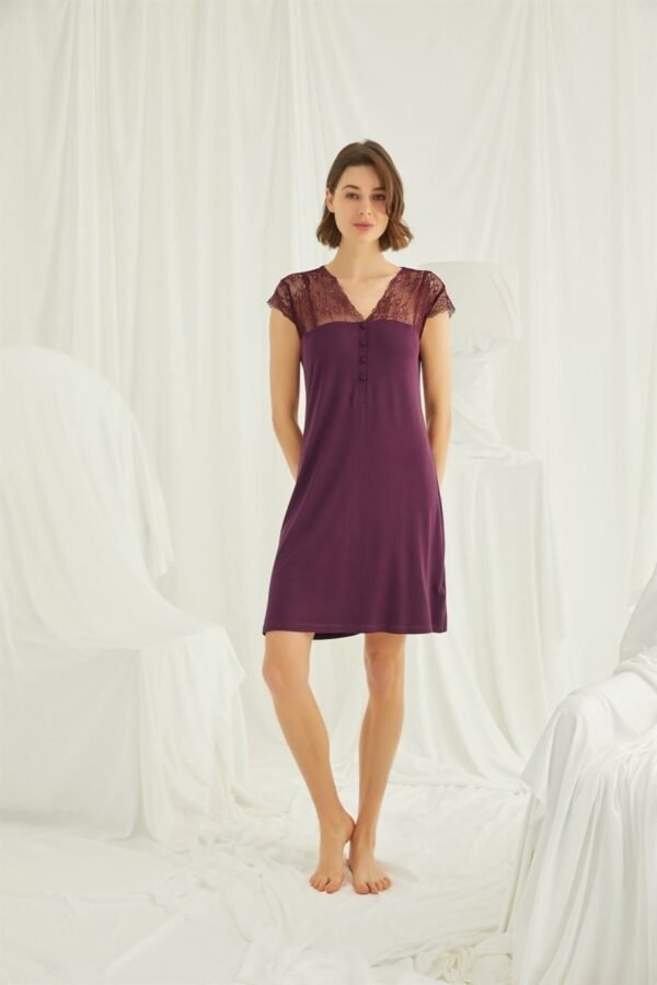 Designen inkluderar en djup V-ringning, kort ärm med spetsdetaljer som sträcker sig från ärmen upp till bröstet, samt knäppning under kragen för en klassisk och feminin touch. Den röda färgen tillför värme och elegans till din kvällsrutin.