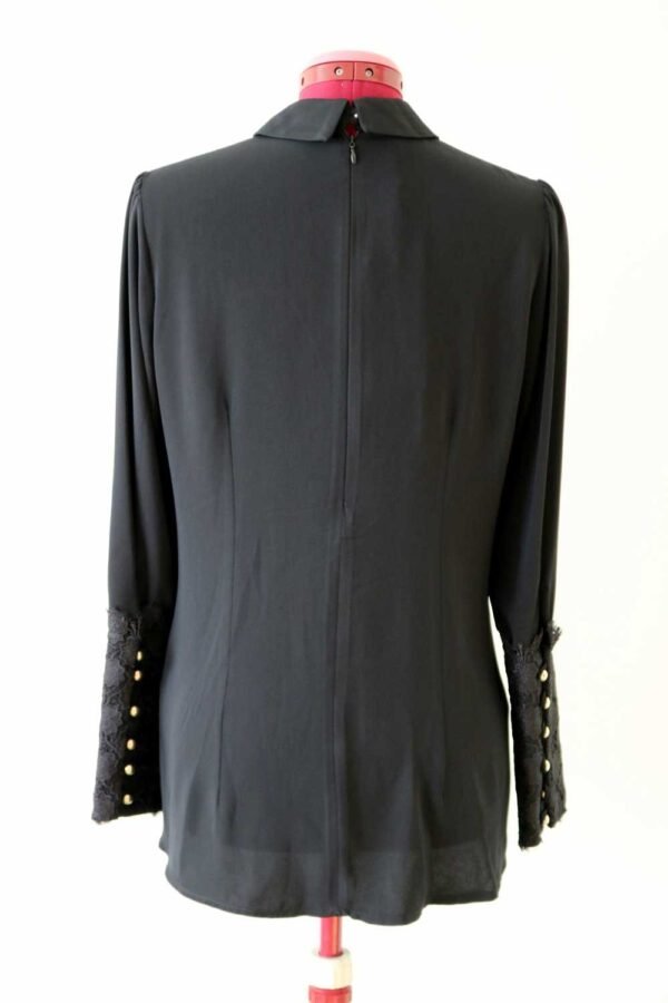 Denna stilfulla blus har en nätt rundad krage och en dragkedja i ryggen som ger en modern och sofistikerad touch. Ärmarna avslutas med bred spetskant för en feminin känsla som lyfter hela plagget.