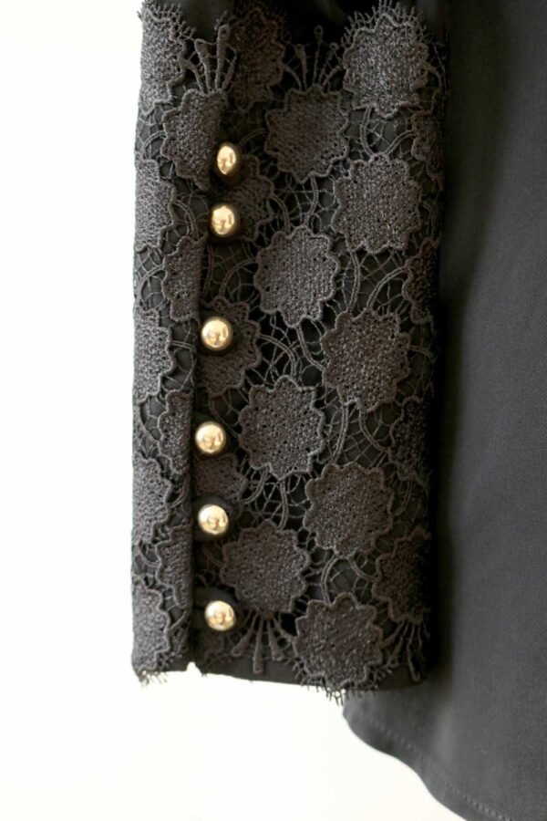 Med sin moderna design och praktiska dragkedja i ryggen är detta ett plagg som kombinerar funktion med stil. Ärmarna avslutas med bred spetskant för en extra elegant känsla.