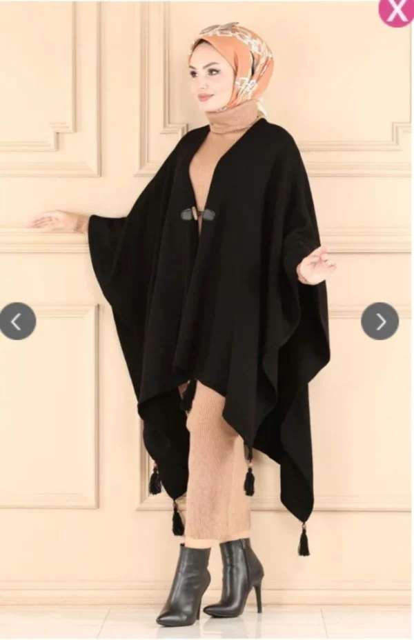Den klassiska svarta färgen ger ett sofistikerat uttryck och gör ponchon lätt att matcha med slöja, sjal och accessoarer i olika färger och material. Kombinationen av modern design och traditionell elegans gör plagget perfekt för kvinnor som söker en balanserad och stilren modest look.