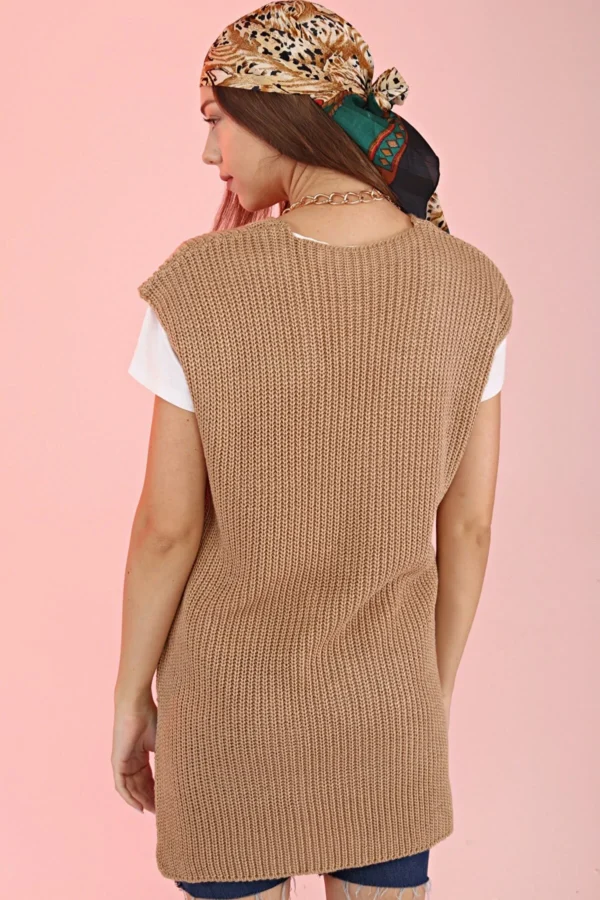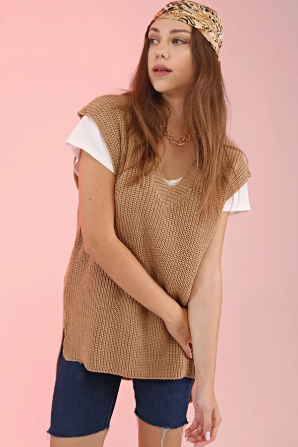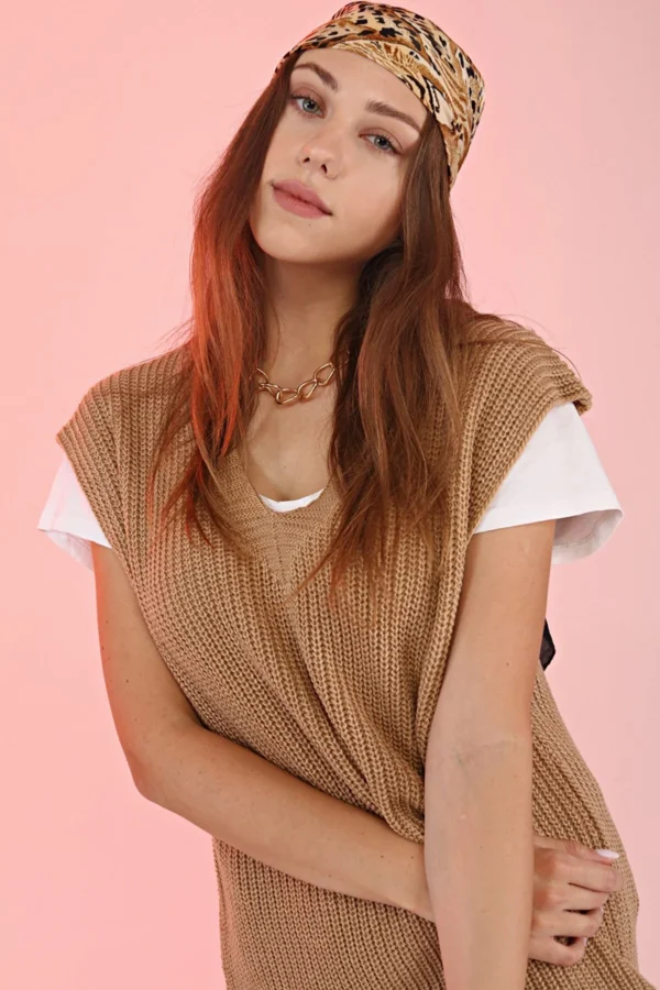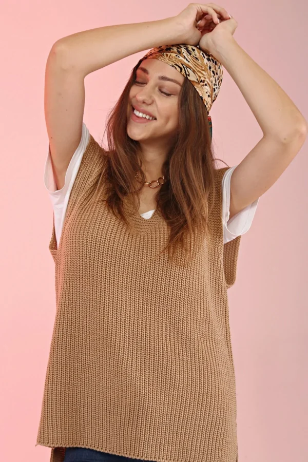 Ribbstickad Slipover – Beige är inte bara bekväm, utan också praktisk och hållbar. Den är idealisk för kvinnor som vill ha ett mångsidigt plagg som kan bäras året runt, kombinerat med andra modest kläder för en komplett look.
