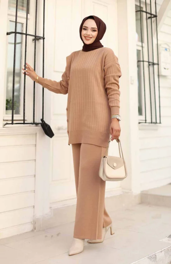 Stickat Set Med Knappar – Beige är det perfekta valet för en elegant och bekväm stil. Setet består av en figursydd topp och en byxor, båda med stiliga knappdetaljer, som ger en sofistikerad look. Tillverkat i mjukt stickat material för både komfort och hållbarhet, är detta set idealiskt för både vardag och fest. Den tidlösa beige färgen gör det lätt att kombinera med andra plagg och accessoarer. Ett mångsidigt set som passar perfekt för alla säsonger och tillfällen.