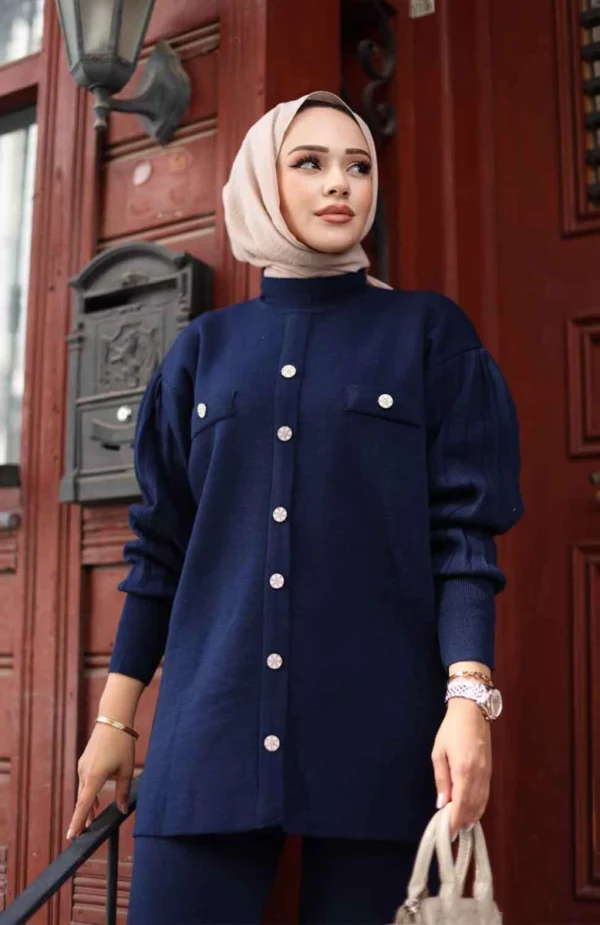Setet är tillverkat av ett mjukt och följsamt stickat material med känsla av lyxiga Dubai-inspirerade tyger, vilket ger en behaglig komfort hela dagen. Den mörkblå färgen är klassisk, tidlös och mycket lätt att matcha med slöja, sjal och olika accessoarer. Den tvådelade designen består av en stickad topp med vida ärmar som ger ett modernt uttryck, samt matchande byxor med bekväm passform. Finns i storlekar S–XL, anpassad för olika kroppstyper.