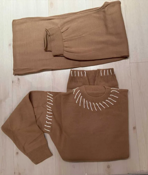 Kliv in i en värld av stil och komfort med vår Beige Tvådelad Stickad Kostym, perfekt för både vardag och festliga tillfällen. Denna kostym är tillverkad av lyxigt, mjukt garn som ger en följsam känsla och smickrande silhuett. Den tidlösa beige färgen gör den lätt att kombinera med olika accessoarer och skapar en sofistikerad look för Ramadan, Eid, bröllop och sociala evenemang.