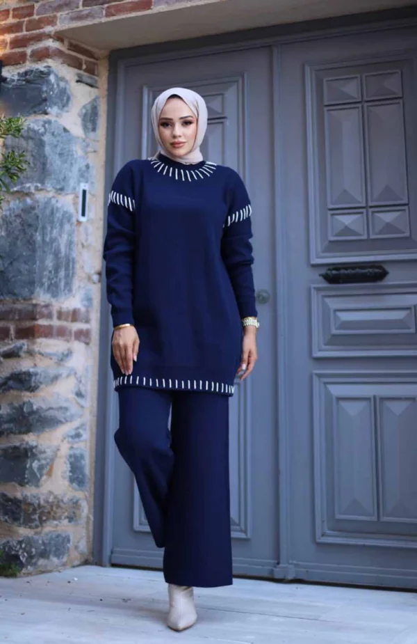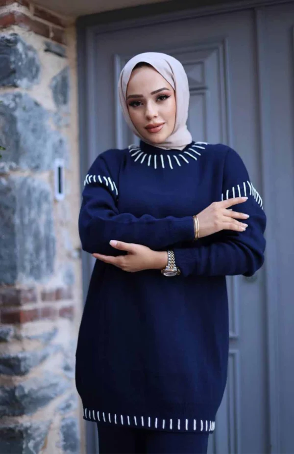 Denna stickad dräkt mörkblå består vanligtvis av en elegant stickad kavaj (eller överdel med kavajliknande detaljer) och matchande byxor eller kjol. Båda delarna är noggrant utformade för att ge maximal rörelsefrihet samtidigt som de bibehåller en professionell och chic look. De stickade detaljerna ger en modern twist till den klassiska kostymdesignen, vilket gör den till en idealisk formell stickad outfit för den som söker något utöver det vanliga. Använd detta stickat set elegant mörkblått för en sofistikerad look på kontoret, vid en presentation, eller en nätverksträff. Det är också det perfekta valet för en elegant middag eller ett socialt evenemang där du vill kombinera komfort med stil.