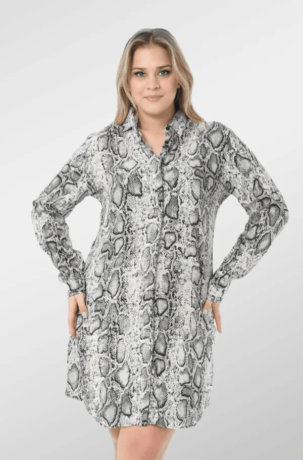 Mönstrad Tunikaklänning – Grå är det perfekta valet för dig som vill kombinera bekväm elegans med en subtil och sofistikerad stil. Denna mångsidiga tunikaklänning är designad för att erbjuda både komfort och en modern estetik, vilket gör den till ett oumbärligt tillskott i varje kvinnas garderob.