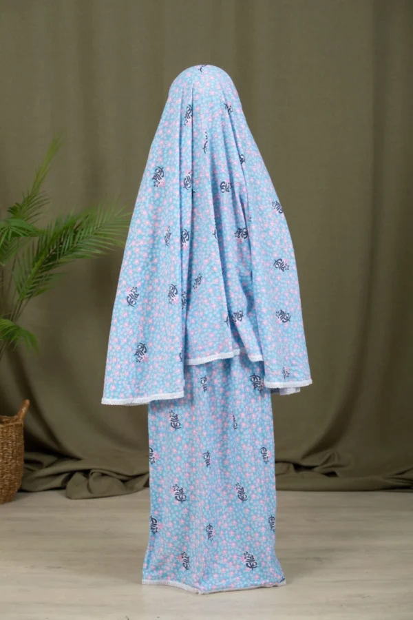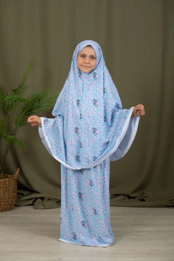 Tvådelat Set Bönekläder för Flickor – Blå är den perfekta kombinationen av andakt, komfort och elegans. Designat för unga flickor som söker en praktisk och vacker lösning för sina bönestunder, erbjuder detta set fullständig täckning och enkelhet – idealiskt för en fridfull och fokuserad andakt.