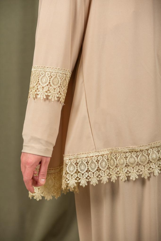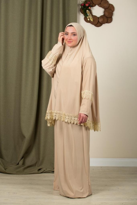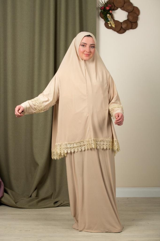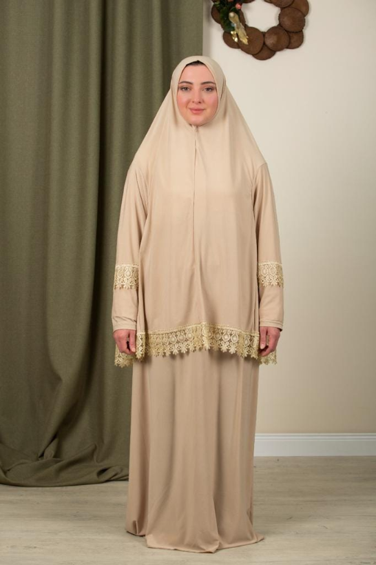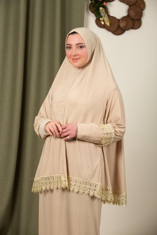 Tvådelat Set Bönekläder med Spetsdetaljer – Cashew Beige: Ett bekvämt och elegant tvådelat bönekläderset i cashew beige med fina spetsdetaljer. Designat för full täckning och enkelhet, perfekt för en fridfull bönestund med en touch av ly