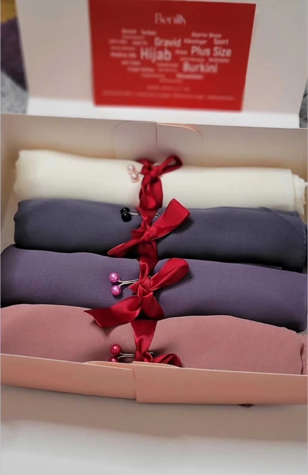 För den som letar efter den perfekta gåvan till en nyligen beslöjad kvinna är vårt Hijab Gåvoset det ultimata valet. Detta set innehåller fyra vackra chiffon hijab i en variation av lila, rosa, mörkgrå och off white färg.