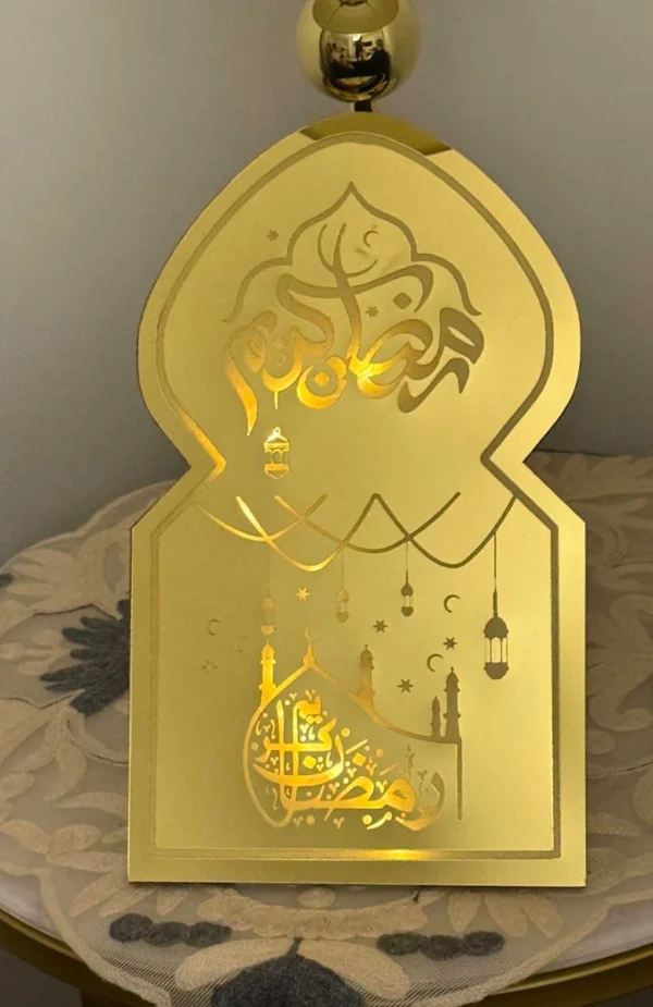 Den är en modern och vacker inredningsdetalj som förhöjer din Ramadan-stämning. Tillverkad i trä och utrustad med LED-lampor, ger denna dekoration ett varmt och inbjudande ljus under den heliga månaden. Perfekt för att skapa en festlig och andaktsfull atmosfär, passar den både som väggdekoration och bordssmycke. En idealisk lösning för att kombinera traditionell Ramadan-dekoration med en modern touch.