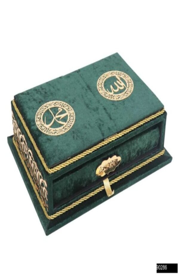 Grönt Koran Presentset: Velourlåda + Medelstor Arabisk Koran (17×24 cm) – Bärväska och Koranställ